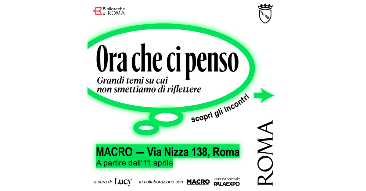 Da giovedì 11 aprile 2024, insieme a Lucy – Sulla cultura e MACRO, Biblioteche di Roma propone: Ora che ci penso. Grandi temi su cui non smettiamo di riflettere, un ciclo di incontri sulle grandi questioni del nostro tempo che verranno prese in esame, da ambiti e prospettive diverse, con l’ambizione di stimolare un dibattito continuo. Al centro degli incontri saranno infatti i grandi dilemmi che da sempre animano l’uomo: il rapporto con i padri e le madri, il potere, la natura, la Storia; insieme con quelli che, invece, sono propri del nostro tempo: l’insonnia, l’ansia, le shitstorm su Internet, l’Europa.